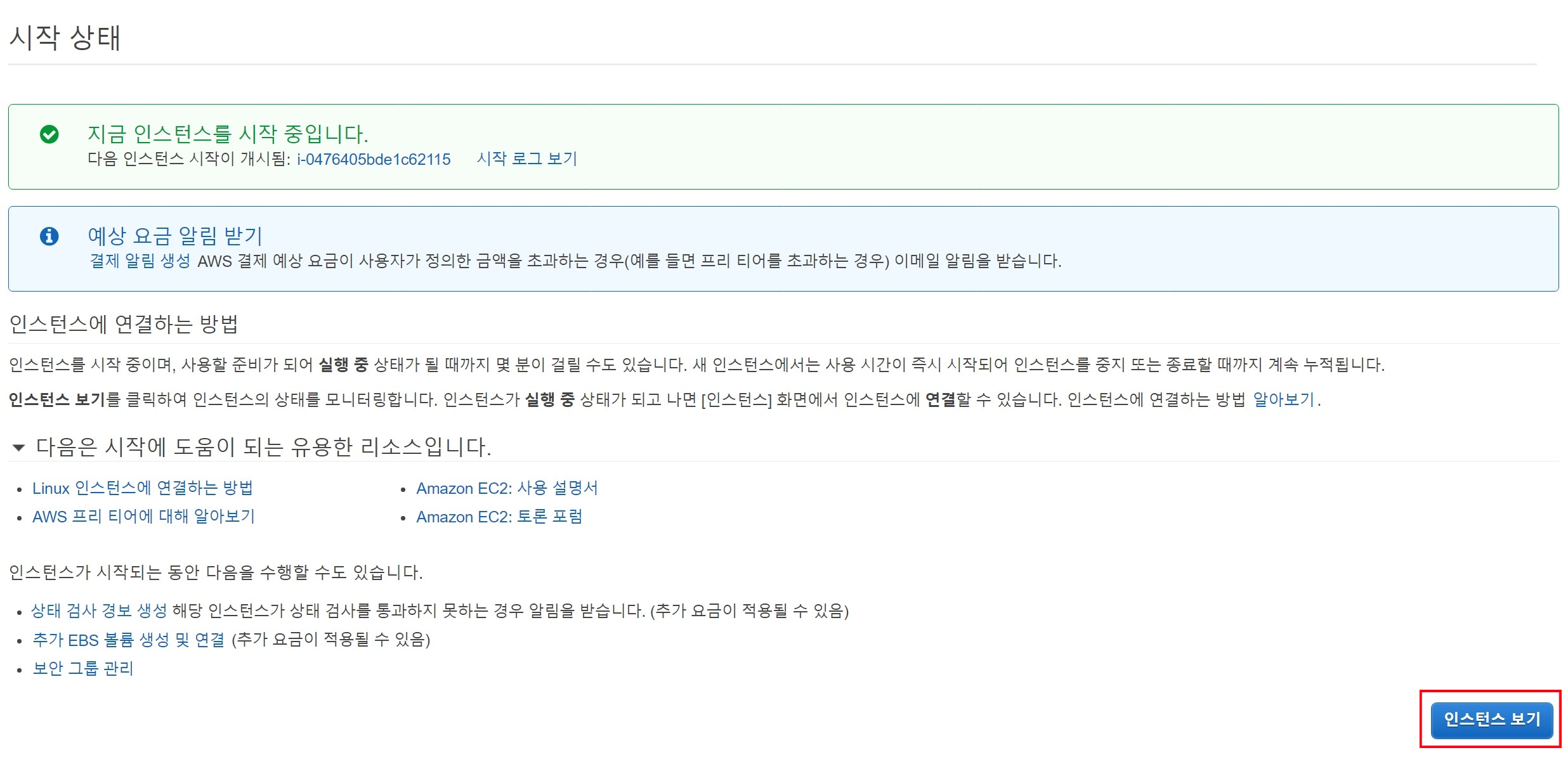 인스턴스 시작을 클릭해서 인스턴스를 최종적으로 생성할 수 있다.
