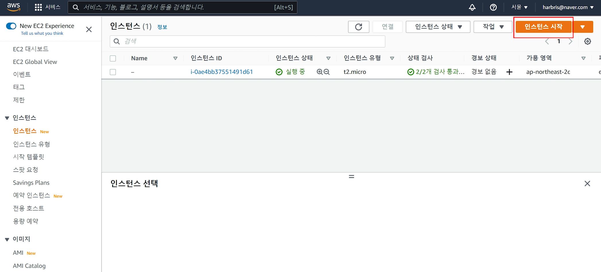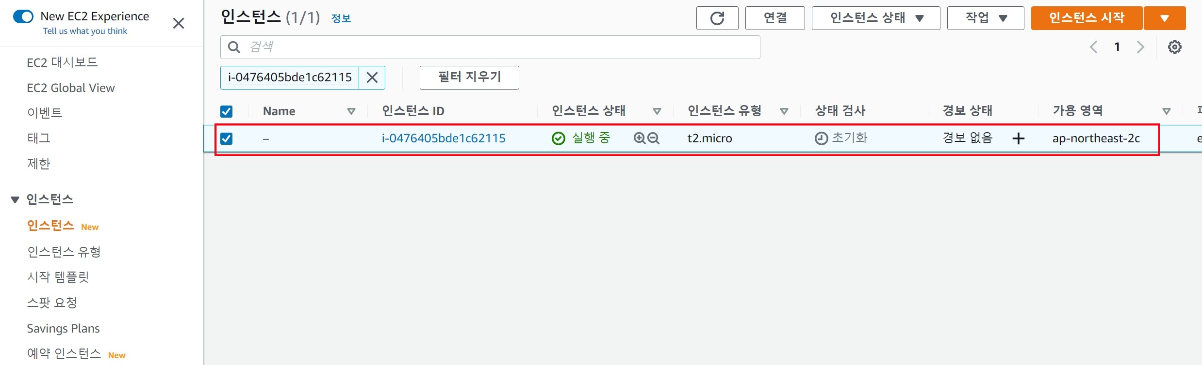 그리고 인스턴스 리스트에 인스턴스 하나가 보이는 것은 이미 한 개의 인스턴스를 생성했기 때문이다.