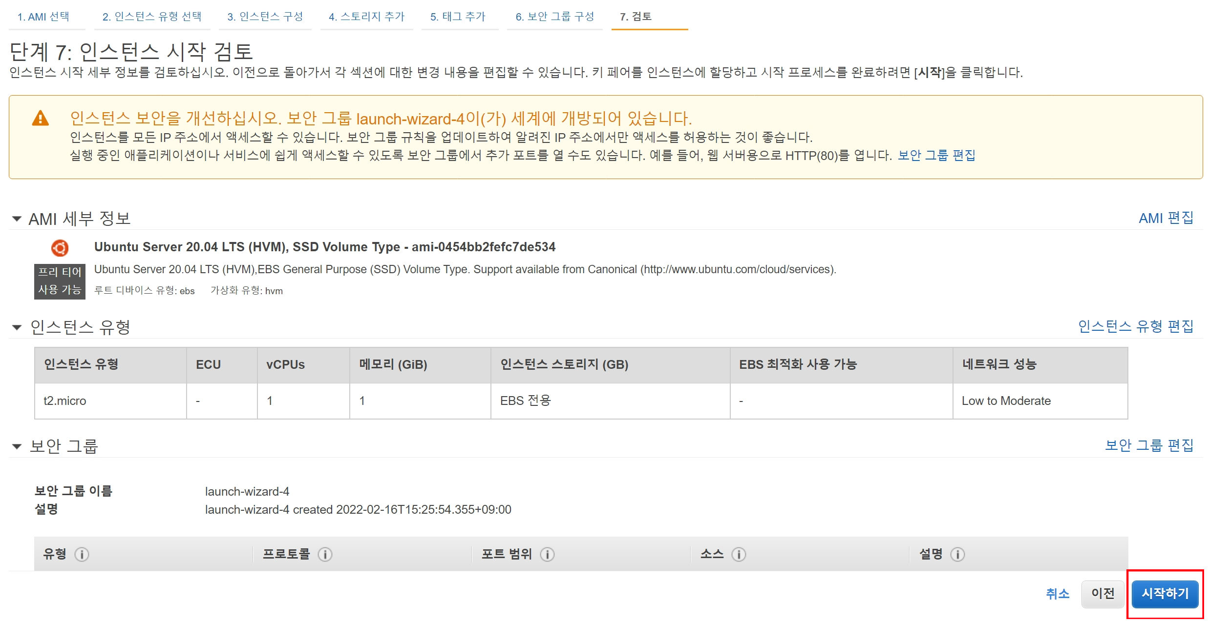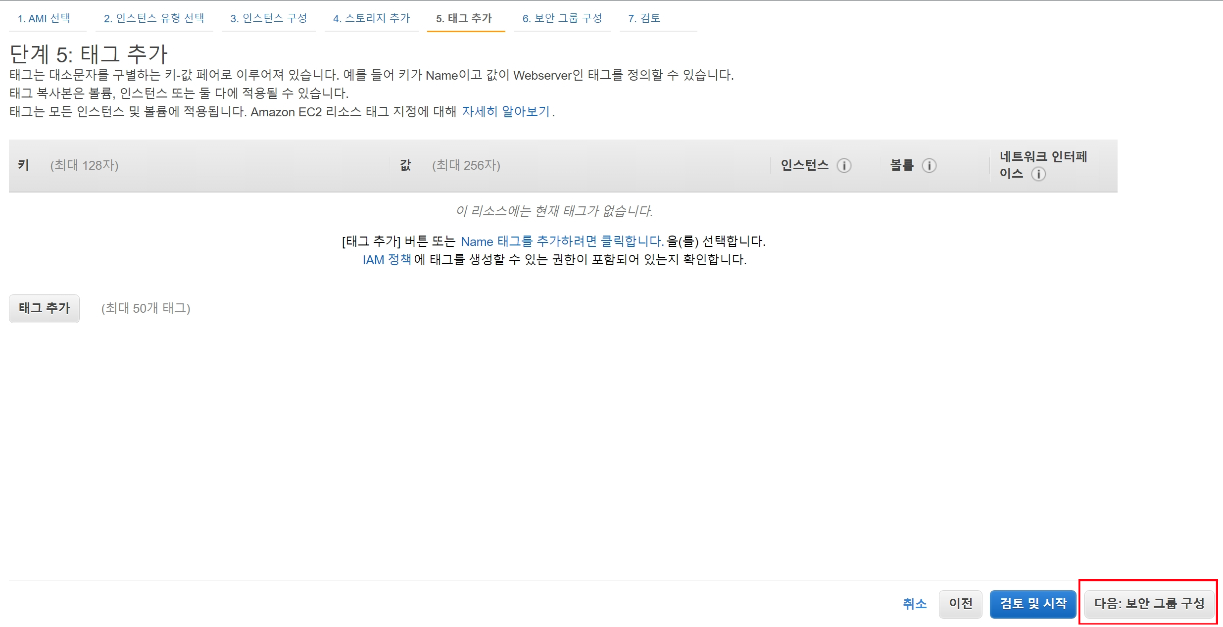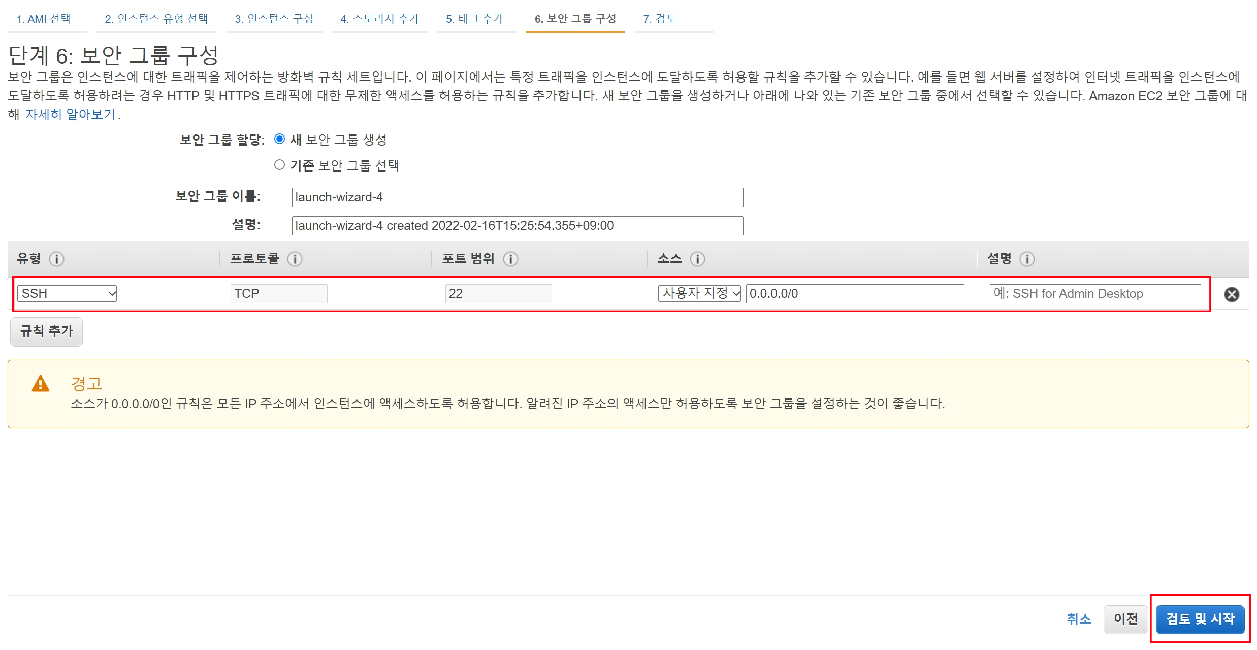 인스턴스 생성 - 보안 그룹 구성 여섯 번째 과정은 보안 그룹을 지정이다.