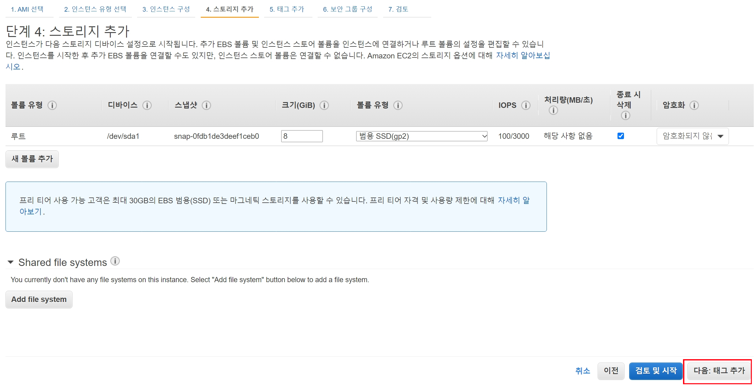 인스턴스 생성 - 스토리지 설정 네 번째 과정은 스토리지 구성이다.
