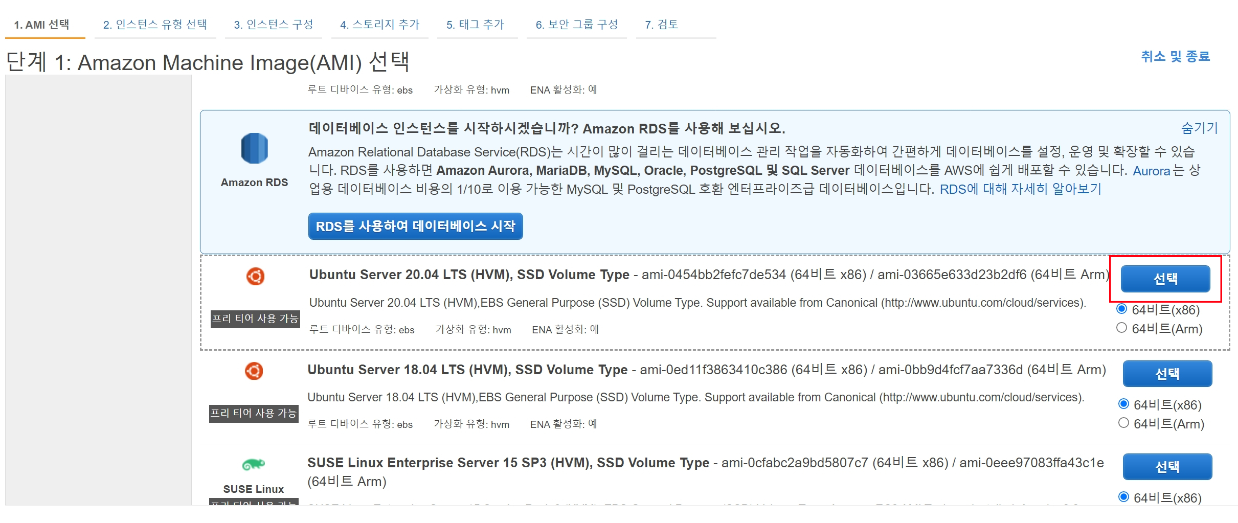 인스턴스 생성 - AMI 선택 리눅스로 진행을 할 것이고, Ubuntu Server 20.04를 선택하면 된다.