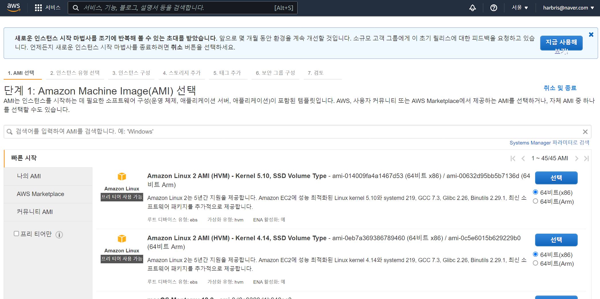 인스턴스 생성 - AMI 선택 첫 번째 과정은 AMI 선택이다.