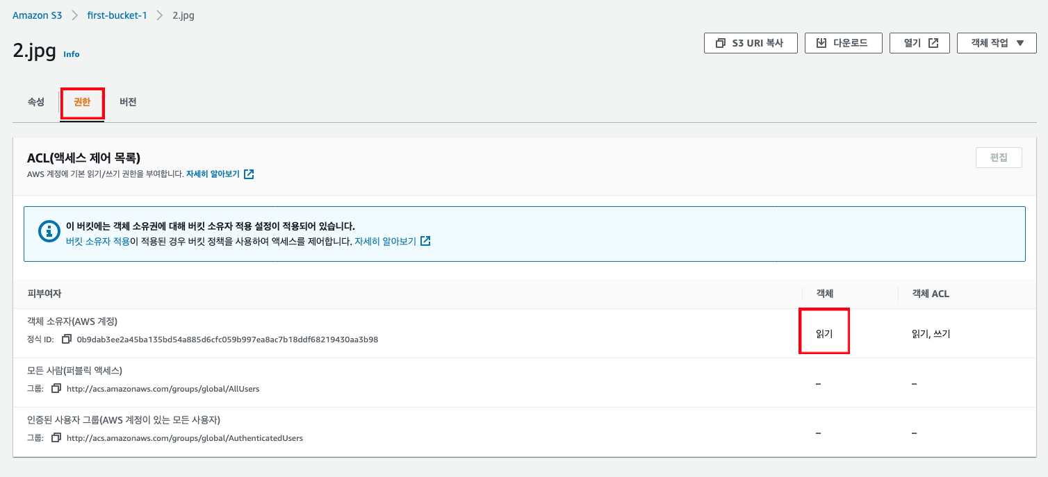파일을 브라우저에서 호출해서 보기 위해서는 객체 소유자가 아닌 모든 사람에게 읽기 권한이 있어야 한다.