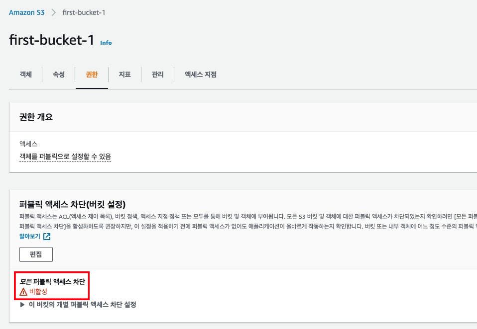 버킷 - 권한 역시 버킷에 권한 중에 모든 퍼블릭 액세스 차단이 활성화되어있다.