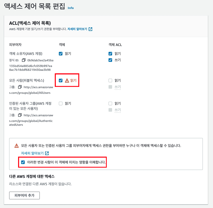 버킷 - 객체 소유권 편집 ACL 활성화됨을 선택하고
